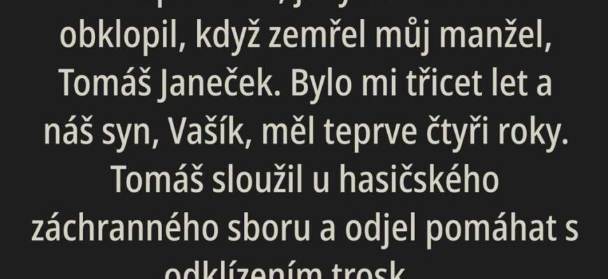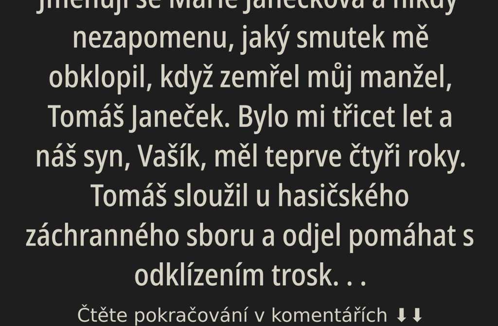 Jmenuji se Marie Janečková a nikdy nezapomenu, jaký smutek mě obklopil, když zemřel můj manžel, Tomáš Janeček. Bylo mi třicet let a náš syn, Vašík, měl teprve čtyři roky. Tomáš sloužil u hasičského záchranného sboru a odjel pomáhat s odklízením trosky po zemětřesení do Asie. Bohužel, už se domů nevrátil. Spolu s ním zahynul i jeho věrný pes, německý ovčák, kterého vychoval od štěněte Zor.