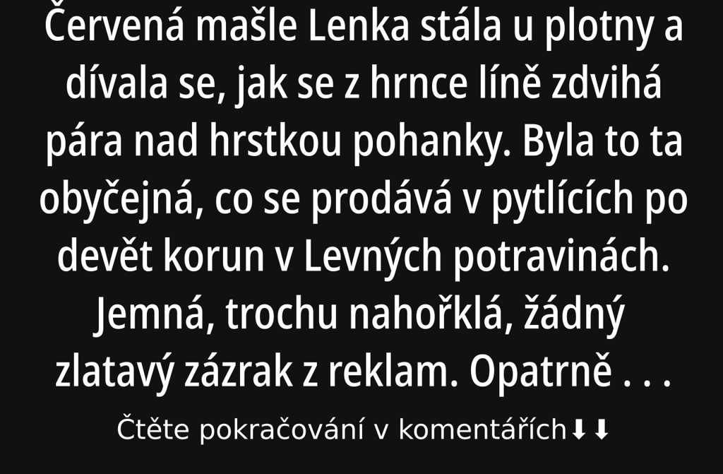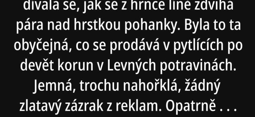 Lenka stála u plotny a dívala se, jak se z hrnce líně zdvihá pára nad hrstkou pohanky. Byla to ta obyčejná, co se prodává v pytlících po devět korun v Levných potravinách. Jemná, trochu nahořklá, žádný zlatavý zázrak z reklam. Opatrně promíchala lžící, přiklopila poklicí a opřela se zády o starou ledničku Calex. Uvnitř zanaříkala, jakoby jí něco v Lence schvalovalo, tichá symfonie unavených kuchyní v sídlištním paneláku.