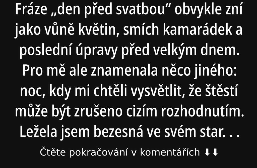 Fráze den před svatbou obvykle zní jako vůně květin, smích kamarádek a poslední úpravy před velkým dnem. Pro mě ale znamenala něco jiného: noc, kdy mi chtěli vysvětlit, že štěstí může být zrušeno cizím rozhodnutím.
