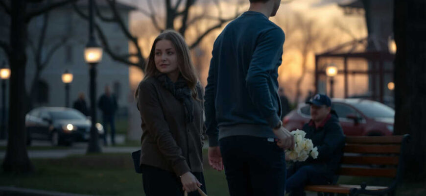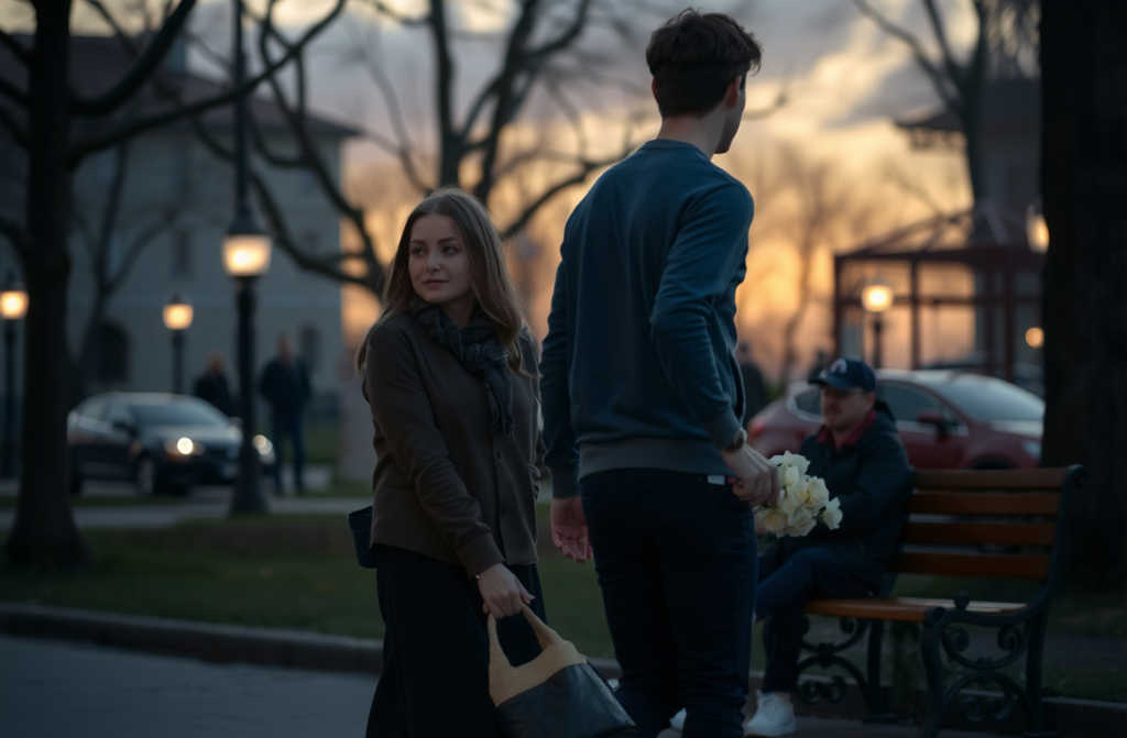 Na dřevěné lavičce zůstal pugét růží, nikoliv jako symbol lásky, ale spíš nezištné blbosti…