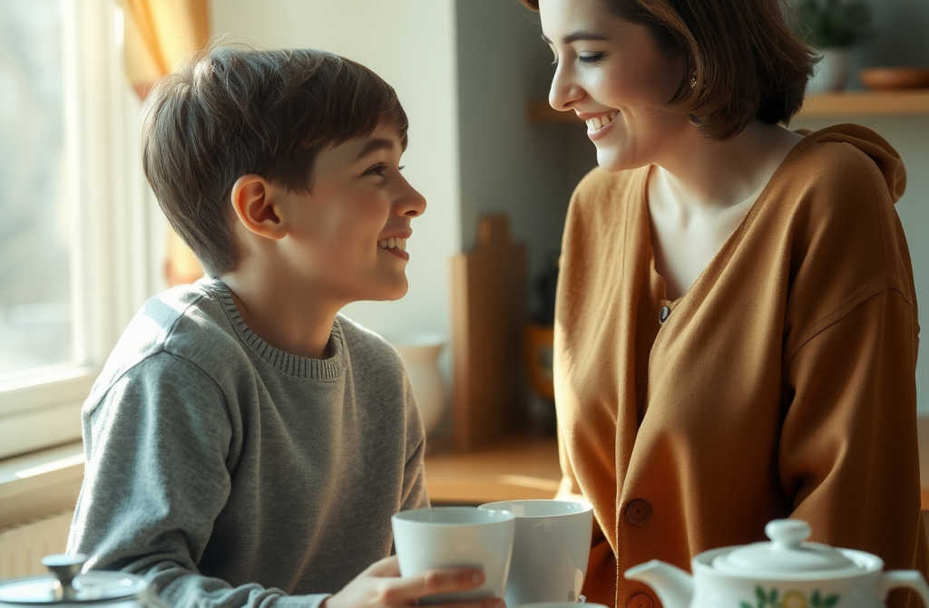 Sednou si ke stolu. Lukáš si nalije čaj