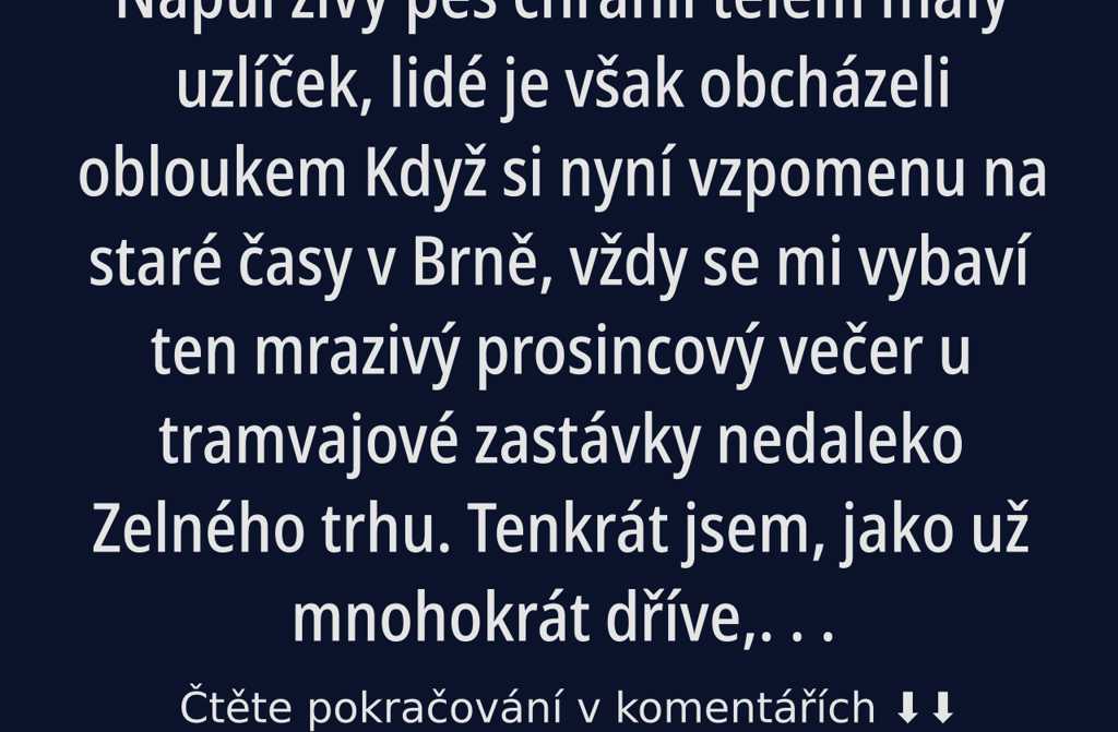 Stála tam dívka v šedé bundě, s taškou plnou nákupu a znavenýma, ale laskavýma očima. Přiklekla a pohladila fenu po hlavě.