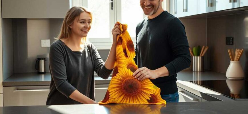 Čistá kamenná deska je přikryta oranžovým ubrusem s obrovskými slunečnicemi. Okraje ubrusu visí vlnami, zakrývají spodní zásuvky.
