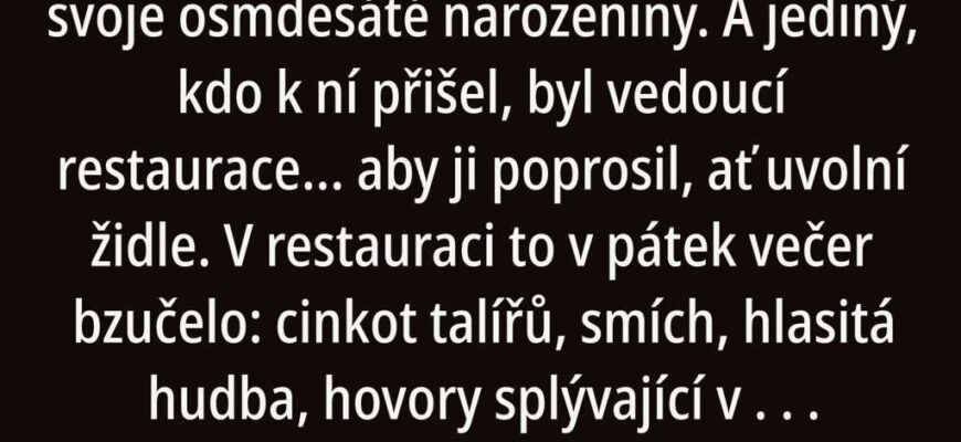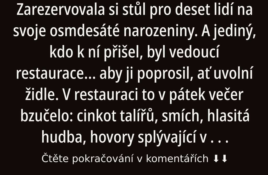 Zarezervovala si stůl pro deset lidí na svoje osmdesáté narozeniny. A jediný, kdo k ní přišel, byl vedoucí restaurace aby ji poprosil, ať uvolní židle.