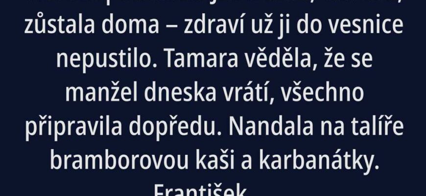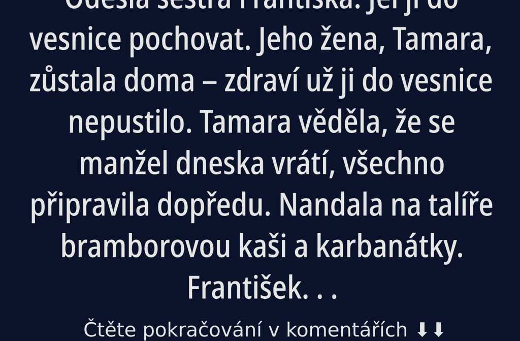 Odešla sestra Františka. Jel ji do vesnice pochovat. Jeho žena, Tamara, zůstala doma zdraví už ji do vesnice nepustilo. Tamara věděla, že se manžel dneska vrátí, všechno připravila dopředu. Nandala na talíře bramborovou kaši a karbanátky. František přišel do kuchyně.