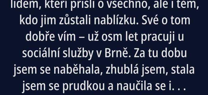 Někdy není těžko jen lidem, kteří přišli o všechno, ale i těm, kdo jim zůstali nablízku. Své o tom dobře vím už osm let pracuji u sociální služby v Brně. Za tu dobu jsem se naběhala, zhublá jsem, stala jsem se prudkou a naučila se ironii, zvlášť když si někdo dovolil vyjadřovat se nehezky o mé práci. A kdo jste, že máte potřebu řešit mé záležitosti? ptávala jsem se zvědavců a pohledem spod zrzavé ofiny a zelených očí je spálila natolik, že okamžitě ztratili chuť vtíravě pokračovat. Nebo se naopak rozběhli neznámo kam jak splašený pes. I proto mi začali říkat Věra Moravská Chřipka.
